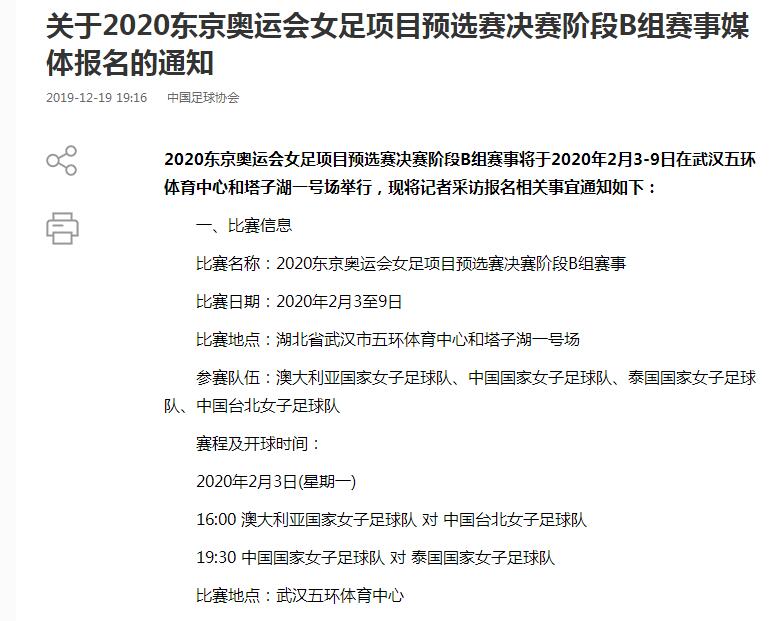 12月19日,足协官网发布消息,公布2020年东京奥运会女足预选赛决赛阶段赛程,中国女足2月3日首战泰国。 2020东京奥运会女足项目预选赛决赛阶段B组赛事将于2020年2月3-9日在武汉五环体育中心和塔子湖一号场举行,现将记者采
