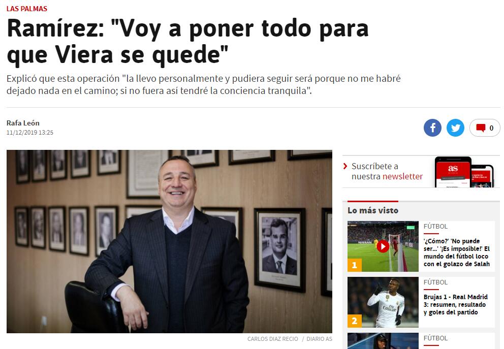 北京时间12月12日消息,据西班牙媒体《阿斯报》报道,北京国安租借至西乙拉斯帕尔马斯的球员比埃拉将迎来自己在老东家的告别战,他将于明年1月份回归国安。 《阿斯报》报道称,拉斯帕尔马斯主席在接受采访时证实了比埃拉将