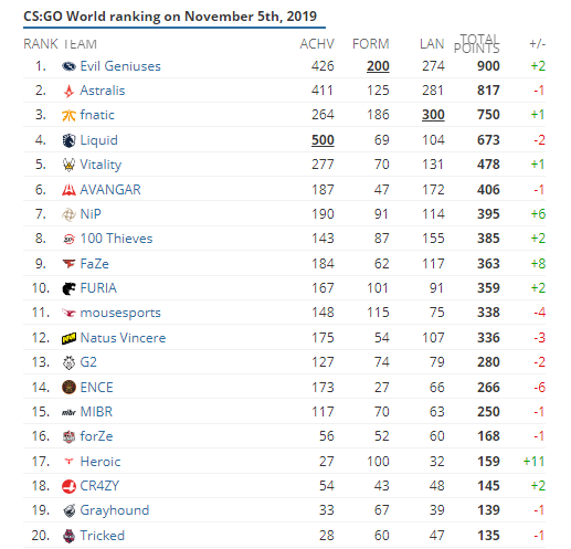 目前排名第一的照旧是Evil Geniuses,第二名则是Astralis,第三名是fnatic。短暂的Liquid王朝目前滑落到了第四名。进步明显的是NIP和FaZe战队,排名分别上升6名和8名。