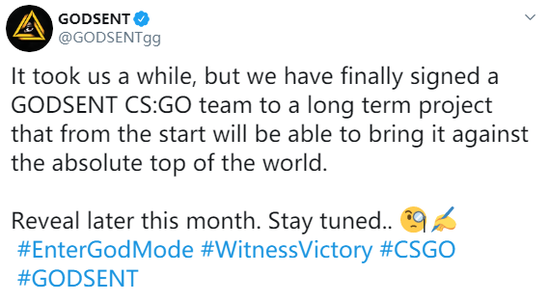 日前GODSENT官方推特宣布曾经签下一支CSGO战队,新阵容将会在本月晚些时分发布。