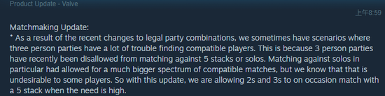 所以V社此前为了准确匹配——单排对单排,双排对双排,三排对三排,五排对五排,招致了本来就不大的匹配池被进一步紧缩,玩家匹配速度十分慢。认识到这点之后,V社就放宽了匹配限制,单排玩家的体验逐渐提升,但组排由于匹配池仍然太小,匹配速度还是很慢,所以V社就进一步放宽匹配限制,约等于除了中心辅助分之外什么都没变……