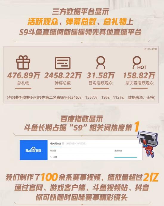在这些措施的推进下,S9在国内的热度不时提升,斗鱼更是成为了中国玩家心目中的S9观赛第一平台。据第三方数据显现,S9斗鱼直播间的总礼物、弹幕总数、日均活泼观众、总决赛活泼观众分别为476.89万、2458.22万、31.58万和158.82万,位列一切直播平台之首。