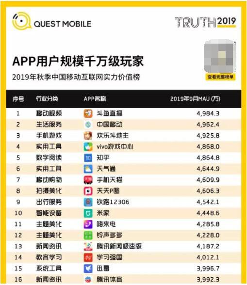 能够说,这些数据无不表现了斗鱼在S9推行过程中的突出奉献,及其作为游戏直播第一平台的影响力。今年9月份,第三方数据机构QuestMoblie发布的《 2019中国挪动互联网秋季大报告》(以下简称QM《报告》)显现,APP用户范围达到千万的玩家中,斗鱼直播以4984万MAU的绝对优势独占鳌头。《报告》还提到,随着斗鱼在挪动端战略的增强,其MUA增速进一步加快,且逐渐与行业内其他平台拉开差距。