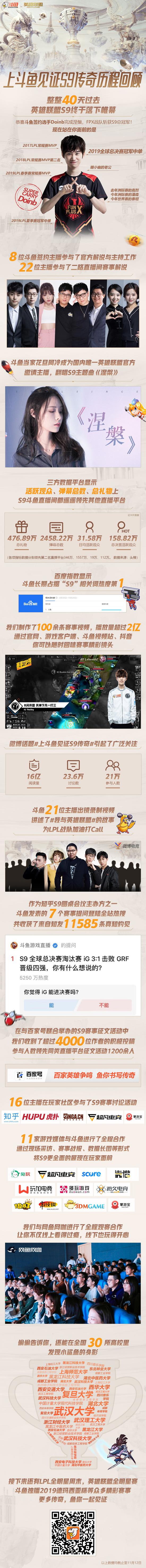 随着英雄联盟S9闭幕,LPL全明星投票今日曾经正式启动。就在昨晚,斗鱼直播平台发布了”上斗鱼见证S9传奇“进程回忆长图,经过长图中各项数据能够看出,斗鱼直播在英雄联盟赛事直播上仍然表现强劲,具有一如既往的统治力。