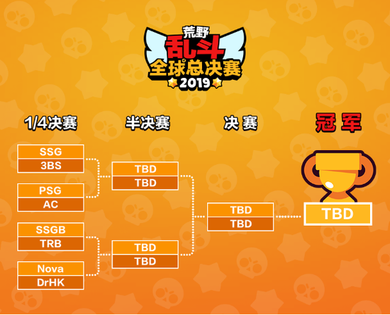 本次荒野乱斗全球总决赛将采用严酷的单败淘汰制,8支战队曾经经过抽签决议首轮对阵。总决赛每场竞赛均将采用5盘3胜制(BO5),其中每一盘则是3局2胜制(BO3)。此外,在每一盘竞赛开端之前,双方队伍各有1次禁用英雄的时机,这对参赛队伍的临场战术调整才能有着不小的考验。