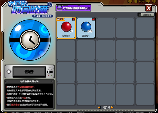 大尼的道具制造机制造的道具和艾儿的角色包,均会保管在“时间胶囊中”,12月12日维护后,才可将“时间胶囊”内的道具传送至公服转送。