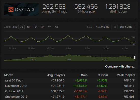 天下苦7.22久矣,在7.23到来一周之后的今天,从SteamCharts的数据能够直观的看出,DOTA2的玩家数终于有了上升。虽热回暖的幅度并不大,但也算是重回了日均40万的大关。