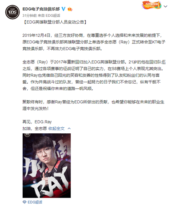 2019年12月4日,经三方友好协商,在尊重选手个人选择和将来开展的前提下,原EDG电子竞技俱乐部英雄联盟分部上单选手全意愿(Ray)正式转会至KT电子竞技俱乐部,不再效能EDG电子竞技俱乐部。