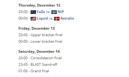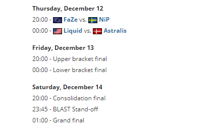 BLAST 全球总决赛将会于12月12-14日停止,地点为巴林王国Riffa。竞赛共四支参赛战队:Astralis、Liquid、FaZe和NIP战队。