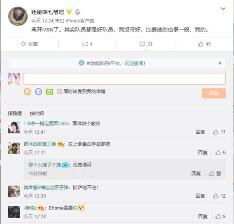 北京时间6月24日12点,Mineski教练“71”在个人微博上宣布本人曾经离队,其原文如下: