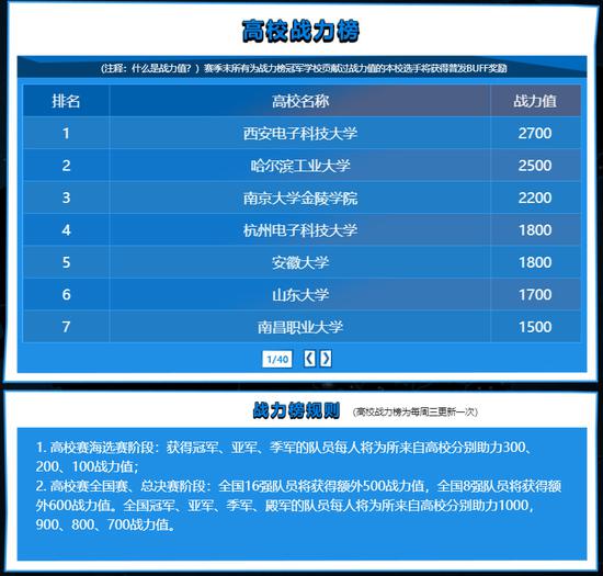 经过第六周的战役,DOTA2和CS:GO两开花的哈尔滨工业大学跃升至战力榜第二。赛季末,一切为战力榜冠军学校奉献过战力值的本校选手将取得普发BUFF奖励哦,快来高校赛为你的母校添砖加瓦吧!