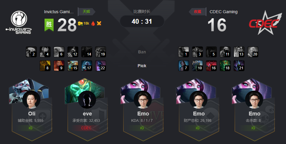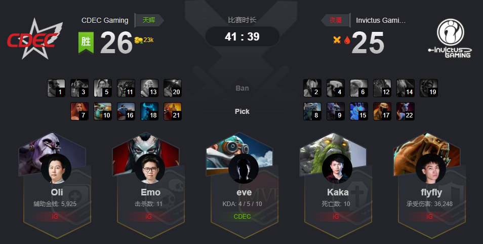 由于CDEC有胜者组的优势,两边相当于是打成了1:1,BO5也打成了BO3。第二局,CDEC拿到了上一把对面选的火女和飞机,以及电魂、赏金和蓝胖。IG则选择了小狗、女王和帕克三核,配上小小和巫医双酱油。