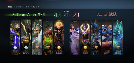 首局Aster团队节拍良好,没有给对方过多时机;第二局双方可谓一波三折,adroit的中单圣堂刺客经济一直领跑,但还是Aster后期团战处置上更胜一筹,2-0打败对手。