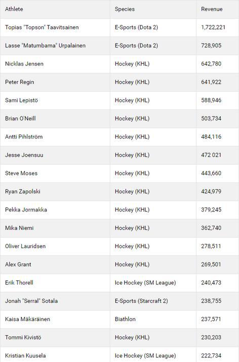 这份榜单中一切的运发动均从事职业冰球项目。除前两名Topson和Matumbaman之外,另外独一上榜的电竞运发动是芬兰星际二天才选手Serral,但他的收入只要238,755欧元。