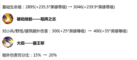 然后我们再来看看加强的,项羽的生命值和被动效果都加强不少, 同时大招的伤害也是增加了,无论是扛伤害还是打输出都比以前要牛一些,作为中华历史上勇猛的霸王,项羽也慢慢配得上这个称号了。