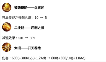 盘古这次的削弱也不少,被动的耐久变少,2技能的减速降低,大招则是伤害降低,不过他最强势的缴械没什么变化,应该还是射手的最大克星。