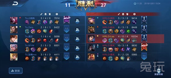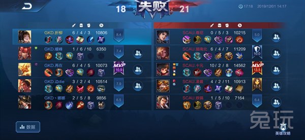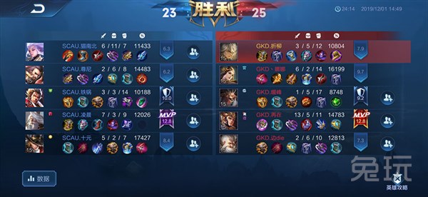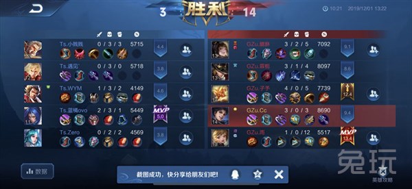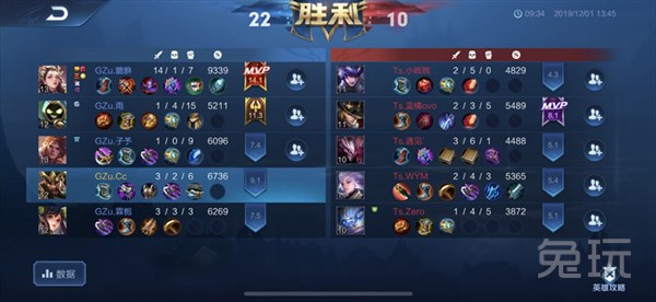 第二局比较精彩,不到10分钟的小局爆发出三十多个人头,其中广大GZU.CC所使用的关羽在对线到TS.小贱贱马超时,接连打出单杀操作。而GZU.貔貅拿出改版后的杨玉环上场,配合太乙真人中辅联动打出大顺风局,在群奶+复活的套路下,GZU.貔貅的一手杨玉环杀到超神,评分达到高分14.1,并且参团率、输出占比都是全场最高。