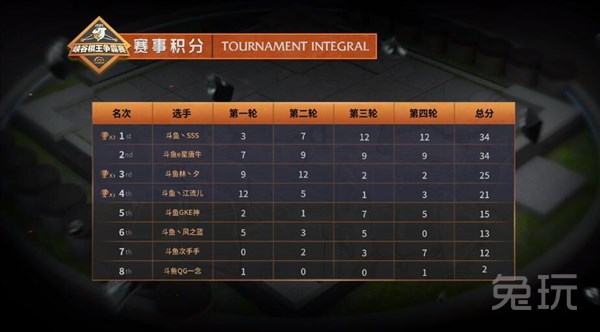 290虽然在首轮没有获得积分,但是在后面三轮均拿到了前两名的成绩,力压众位选手排在第一的位置。不加冰和呆呆啾、永恒G均成功吃鸡一次,排在了第二到第四的位置。