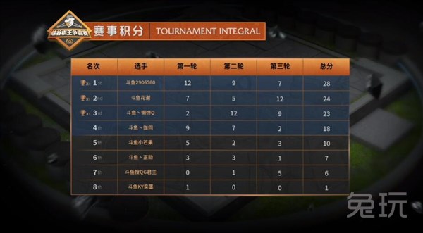 呆呆啾连续三轮表现出色,尤其是后两轮连续吃鸡遥遥领先其他选手排在第一;堕城凭借稳定的发挥位居第二;陈宝宝虽然没能吃鸡,但是三轮都有得分进账,最终排在第三同样获得了月赛资格。