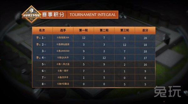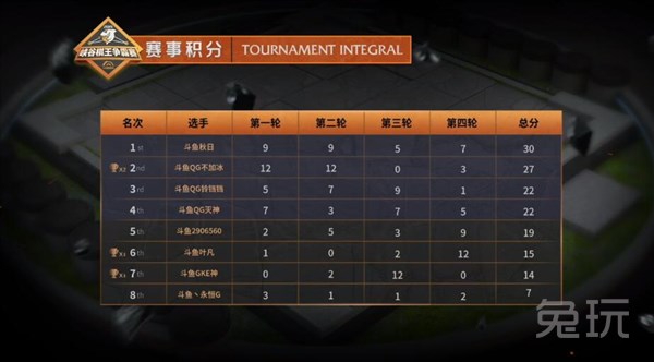 秋日在前四轮中表现不错,均拿到了前三名的好成绩,不过在第五轮中想要选择一个非常规阵容最终没能获得积分,但依然拿到了第一名的好成绩。灭神虽然吃鸡两次,但是第三轮和第五轮没有获得理想的积分,最终以30分位居第二。爱晨潇和铃铛铛分别获得了第三和第四名。