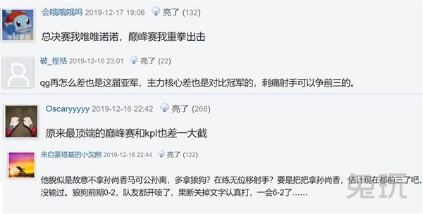 尽管刺痛巅峰赛表现不俗,但还是遭到了一些网友的热议,甚至有网友表示刺痛这是总决赛唯唯诺诺,巅峰赛重拳出击?也有网友表示原来最顶端的巅峰赛和KPL还是差了一大截。当然不乏一些理性的网友,直言QG再差也是秋季赛亚军,刺痛的射手是可以争夺前三的。