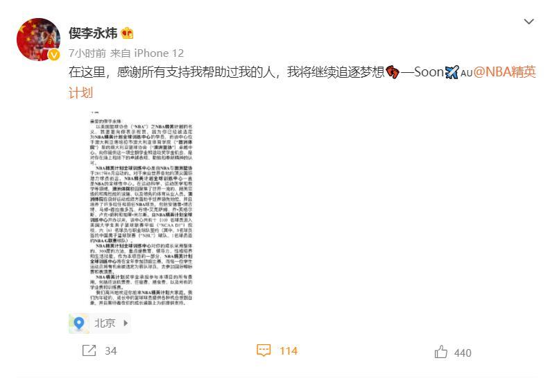 李永炜 又一名中国球员将前往澳大利亚,是一个04年出生的小将,第4人了 北京时间11月23日,偰李永炜在个人社交媒体发文表示感谢所有支持...