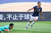 8月9日讯比赛第35分钟,特谢拉带球长驱直入,随后在富力禁区弧顶一脚远射直挂球门死角,苏宁2-0富力。...