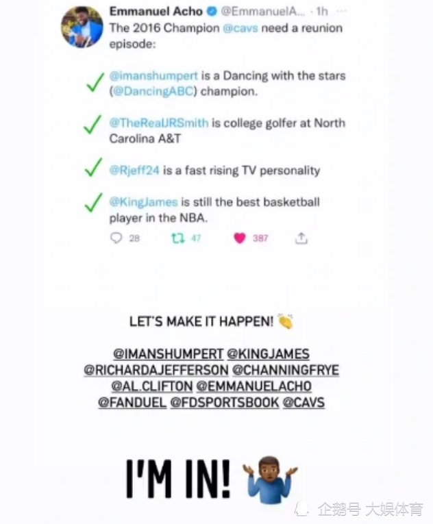 詹姆斯 詹姆斯响应2016年骑士队夺冠成员重聚的建议,生涯最重要冠军! 北京时间11月2...