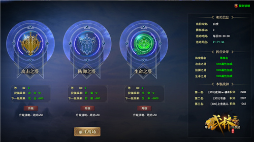 活动场景中分别有生命之塔、防御之塔和攻击之塔。玩法非常简单,三方阵营需要通过占塔、杀怪来获得积分,根据最终积分排名结算奖励。击毁场景中的塔可获得归属权,占领后该塔将作为你所在阵营的“护法”,一旦有其他阵营的玩家经过,它就会给予敌方重创。除了敌人,战场上还不乏拦路小怪,只要击杀便可获得积分。