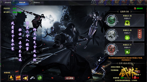 武林争霸、割据征伐、是非恩怨,无论是什么理由,都能使平静的江湖一石激起千层浪。怀揣着各自的算盘与利益的人们明来暗往、斗智斗勇,群雄逐鹿俨然成为了360《武林三》江湖里,各大派别在正邪、强权之间的角斗场——一个零门槛、人人皆可参与、人人皆有收益的跨服战。在群雄逐鹿中,系统会率先根据玩家的帮会以及团体实力,自动分为青龙、白虎、朱雀三大阵营,活动每晚20:30准时开启,战斗持续半小时,届时各路豪侠将齐聚一堂,领略热血江湖的激情碰撞!