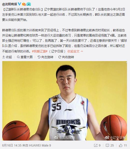北京时间6月17日消息,昨日,《沈阳晚报》在社交媒体上发布了一篇辽篮新队长韩德君伤愈归队的消息,在文字下方竟然配出了一张韩德君身穿首钢男篮球衣的图片。