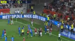 当时这场比赛进行到第70分钟,主场作战的尼斯原本1-0领先占据场上优势,但一部分靠近球场的不理智的主场球迷,开始用水瓶不断袭击客队,而正准备主罚角球的尼斯中场帕耶被狠狠砸中背部,愤怒之余,帕耶捡起水瓶回敬看台的尼斯球迷,这瞬间引起人多势众的主队球迷骚乱,他们直接冲进球场,大规模冲突就此引燃。