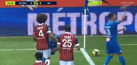 而马赛队中1名黑T恤黑短裤,穿训练背心的助教见势不妙入场维护马赛球员,他大步冲向尼斯骚乱人群,而这名球迷成为了倒霉蛋,他在完全没有防备的情况下,被马赛助教一拳击倒,这一幕惊呆了近在迟尺的尼斯后卫巴德!马赛助教一击必杀后马上撤出现场,免遭源源不断冲入场内的尼斯球迷报复。
