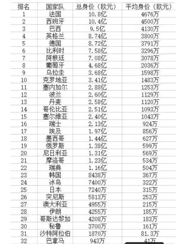 在身价方面,14年的时候阿根廷全队身价排在32强的第四位,总身价为4.752亿,葡萄牙排在32强的第九位,总身价为3.096亿。14年梅西与C罗的身价同为1.2亿,那么梅西队友的身价就比C罗队友的身价高出将近1.7亿。