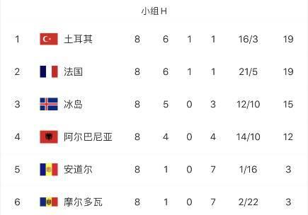 本轮预选赛过后,法国队与土耳其队同积19分,由于相互胜负关系,法国暂列积分榜次席。