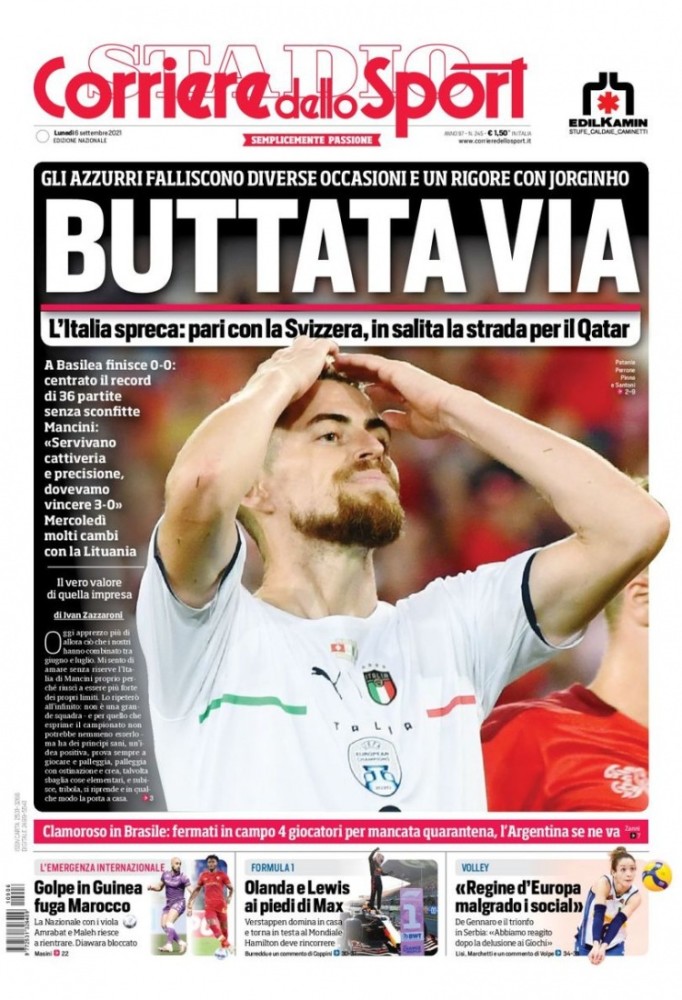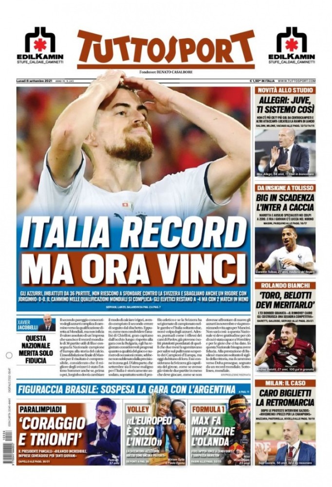 1.“浪费机会和破纪录。”意大利在瑞士再次平局(0-0),36场不败。我们没有进球,因莫比莱和贝拉尔迪状态低迷,若日尼奥罚丢点球,世界杯预选赛并保险。曼奇尼:“浪费了很多机会。”