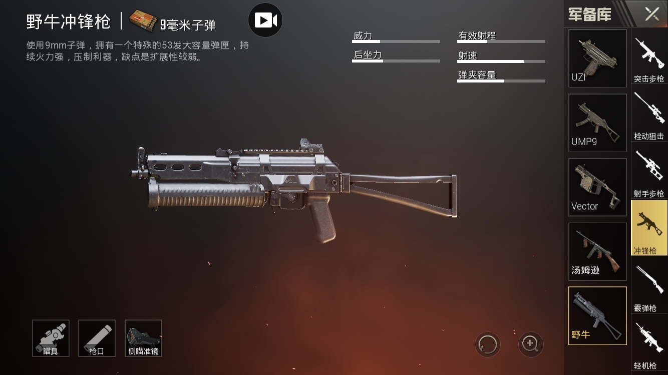 从武器的属性界面中能够看出野牛冲锋枪的弹夹容量是一大特性,最高53发的子弹量也让它超越了大局部武器的最大载弹量,成为了它无独有偶的优势。但是支持的配件数量也却仅有瞄具、枪口与侧瞄准镜,配件数量的确太少了。不过,野牛冲锋枪却有“自带”的枪托、弹夹,一定水平上来讲,野牛冲锋枪在一开端就是近乎满配的状态。