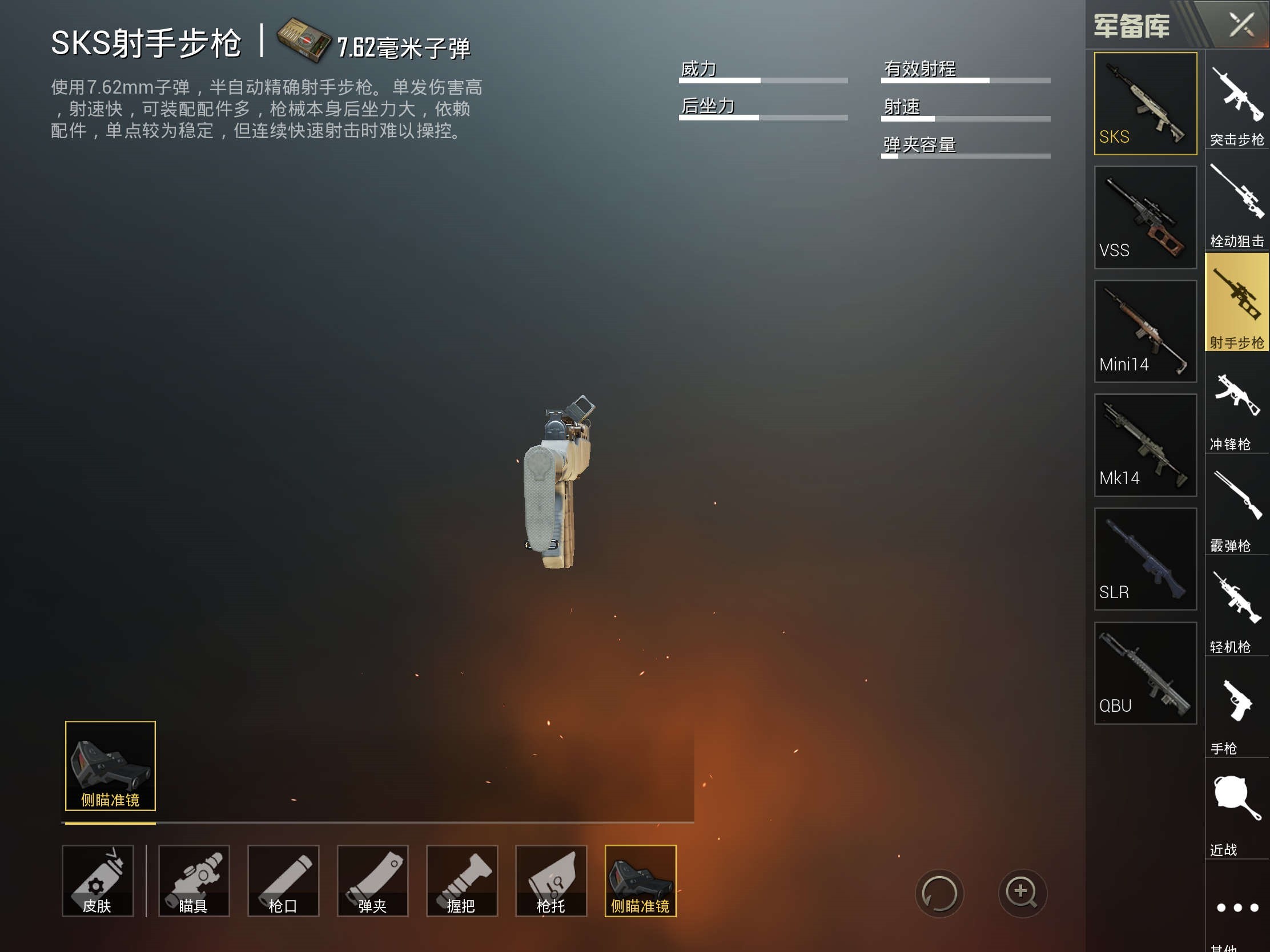 此外,那些SKS、MINI14射手步枪最好也搭配上侧瞄镜,这样来防范近间隔偷袭的敌人,不用赶时间切枪或在背包中现调瞄具糜费时间而错失良机。不过思索到武器的特殊性,有时间能够切换为近战武器的话尽量还是用全自动武器或是霰弹枪,侧瞄镜只在紧急突发状况下起到一个便当瞄准的作用,其装配后的效果输出完整看玩家个人的操作技术或是武器的性能。