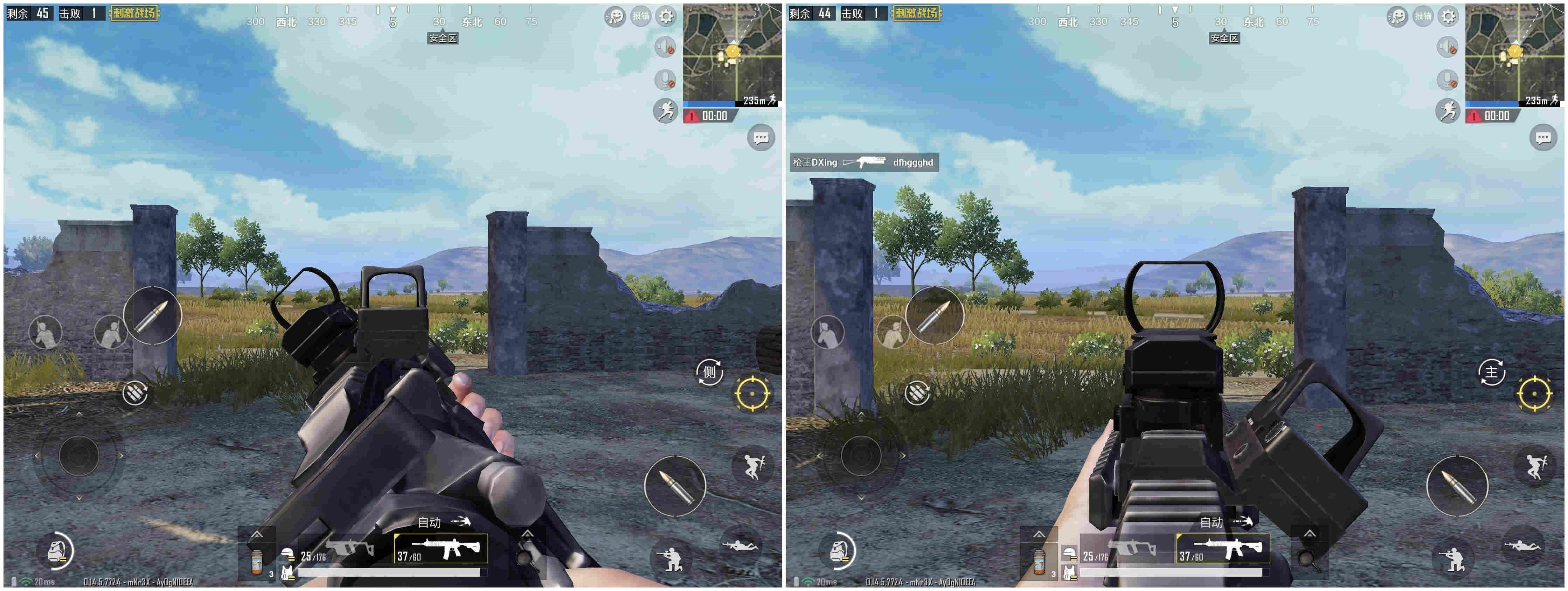 固然侧瞄镜同样是为近间隔战役所准备的辅助配件,但与红点镜相比,它的视野效果普通,不如红点镜看得范围愈加普遍。图中的比照效果明晰可见,左侧的侧瞄镜与右侧红点镜固然瞄准了同一位置,但两者的视野效果是有明显差距的。