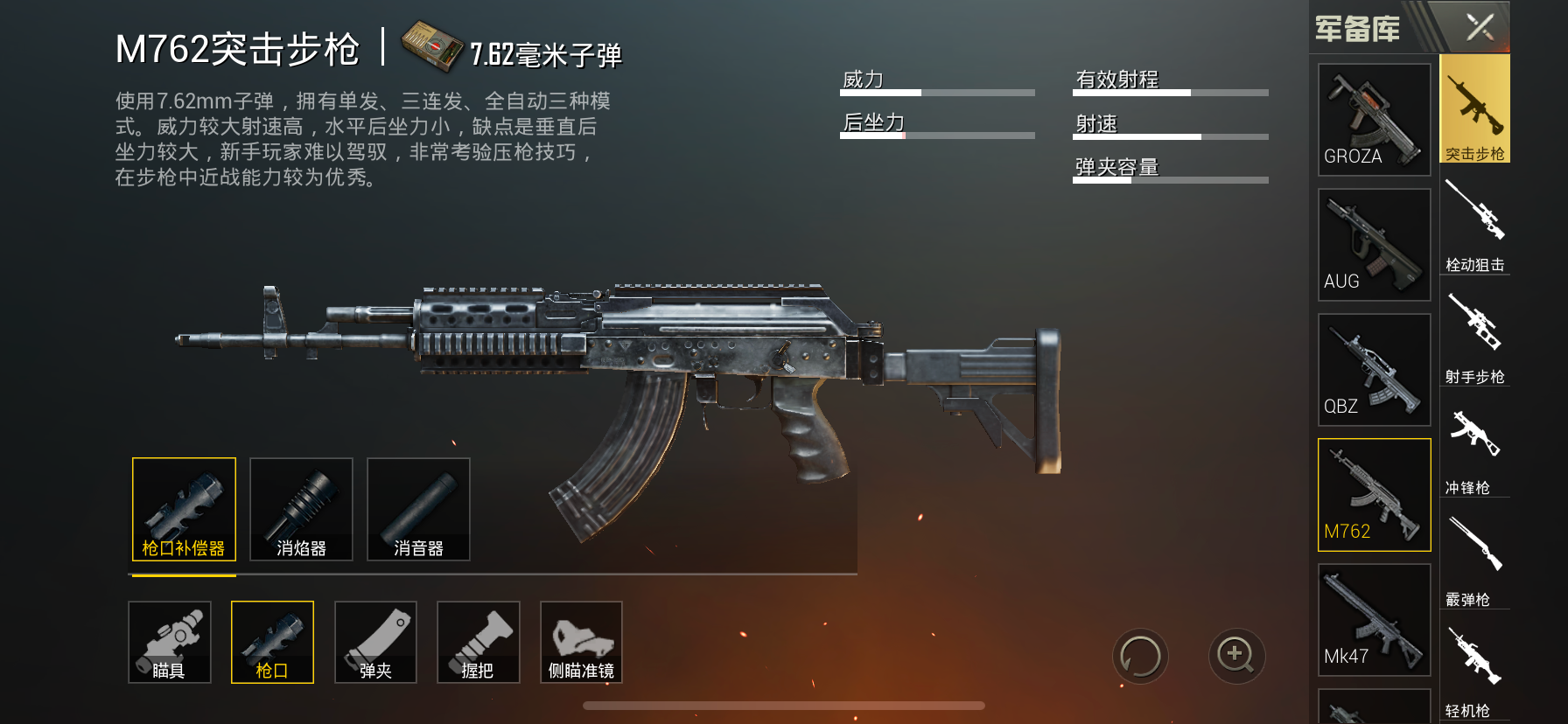 M762这把枪和AKM一样,也是运用7.62子弹的,它的后坐力也是丝毫不弱于AKM,前10发子弹还好,越往后打子弹都要上天了,不得不说在远间隔攻击伤上这把枪的表现才能着实是不太优秀的,所以这把枪也是属于近间隔作战时运用的,消音器能发挥的作用很小,还不如直接拿着枪对敌人一顿突突。其他的近战步枪也是同理,都最好不装配消音器。