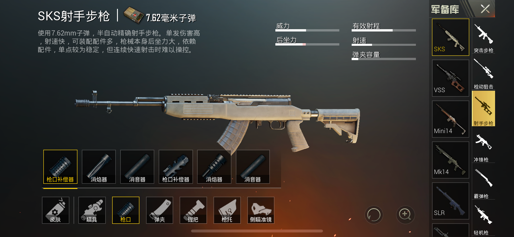 大家一定很好奇,怎样舔包弟把狙击枪也放上来了,狙击枪不是躲在暗处阴人没有声音的属性是最合适的吗?但舔包弟要很遗憾的通知你,SKS固然是一把连狙,但它的后坐力仅次于98K。固然SKS的伤害很高,但连狙都需求快速的击杀敌人,否则很容易乱了节拍,所以需求补偿器来调整手感。当然,假如只是躲在暗处放放阴枪恶心一下对手,SKS还是能够装备消音器的。