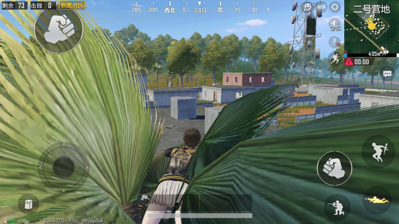 在二号营地中心位置处,有一颗能够藏人的椰子树,我们在落地具有了基本配备和倍镜后,就能够找到中心区独一一颗靠近房子的树,经过爬上离树最近的楼顶,直接跳到树上。上去之后鸡友们能够趴着或者蹲着在树上潜伏敌人,由于椰子树的叶子很大,敌人很难发现,能打出很好的伏击效果。