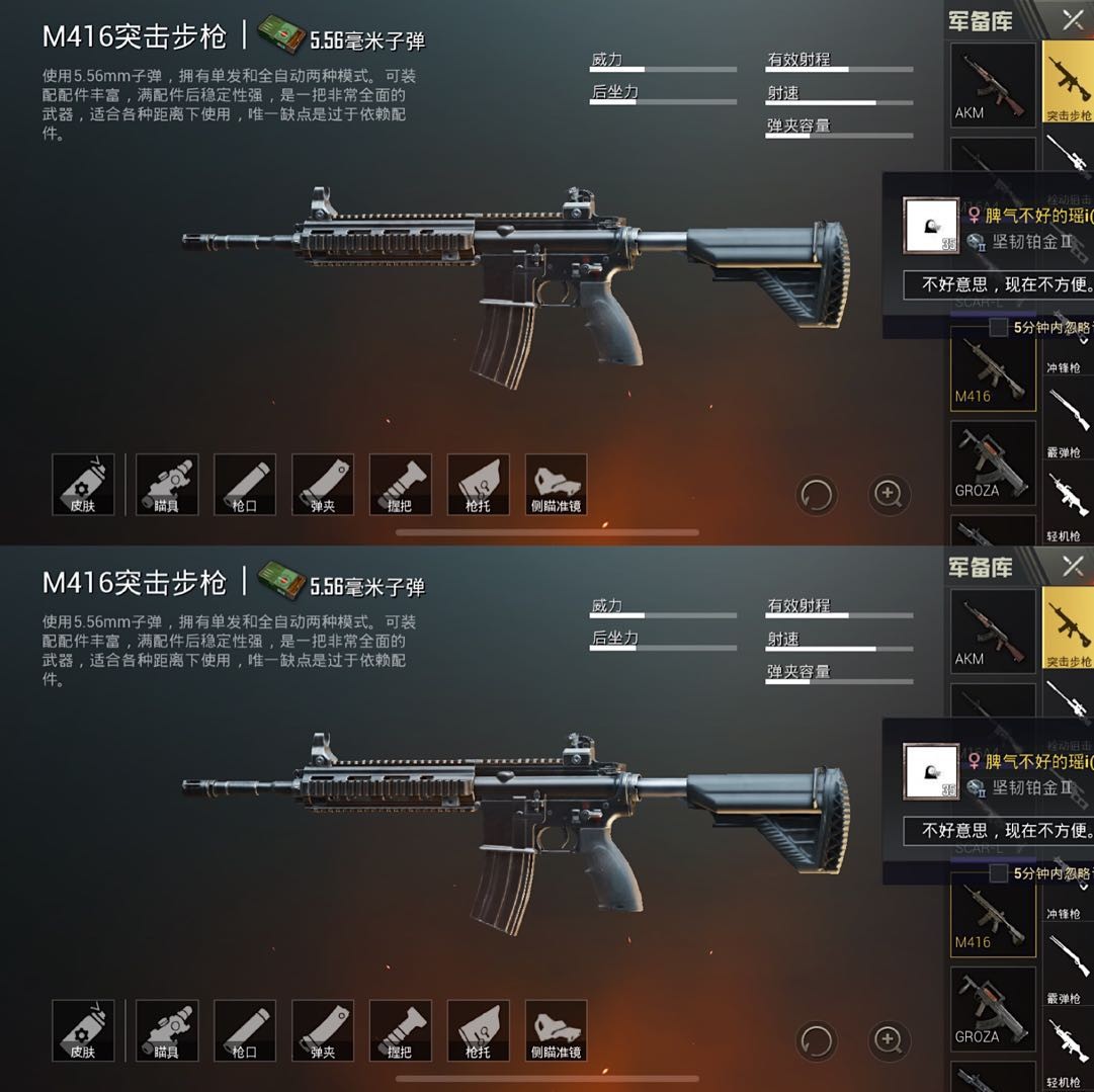 M416在玩家心目中的位置有多高想必不用舔包弟多说,有的玩家对满配M416的喜欢以至连空投武器也不换。双M416这种打法很多大神喜欢,一把配备红点打近战,一把配备高倍镜用来当狙运用,这样能够对付一切的战役,也只需求寻觅5.56的子弹即可。什么?你说别的枪也很强?不听不听,M416在手,天下我有。