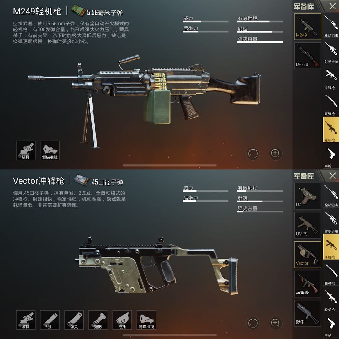 M249是一把空投机枪,被玩家们称为大菠萝,弹夹子弹多是它最大的优点,100发的超高载弹量能够让它停止很好的火力压制,但是它的伤害射速稳定性都普通。而号称短剑的Vector正好和M249互补,满配后的Vector射速超快,在短时间内能够对敌人形成致命打击,两把枪搭配在一同能够说是双剑合璧。