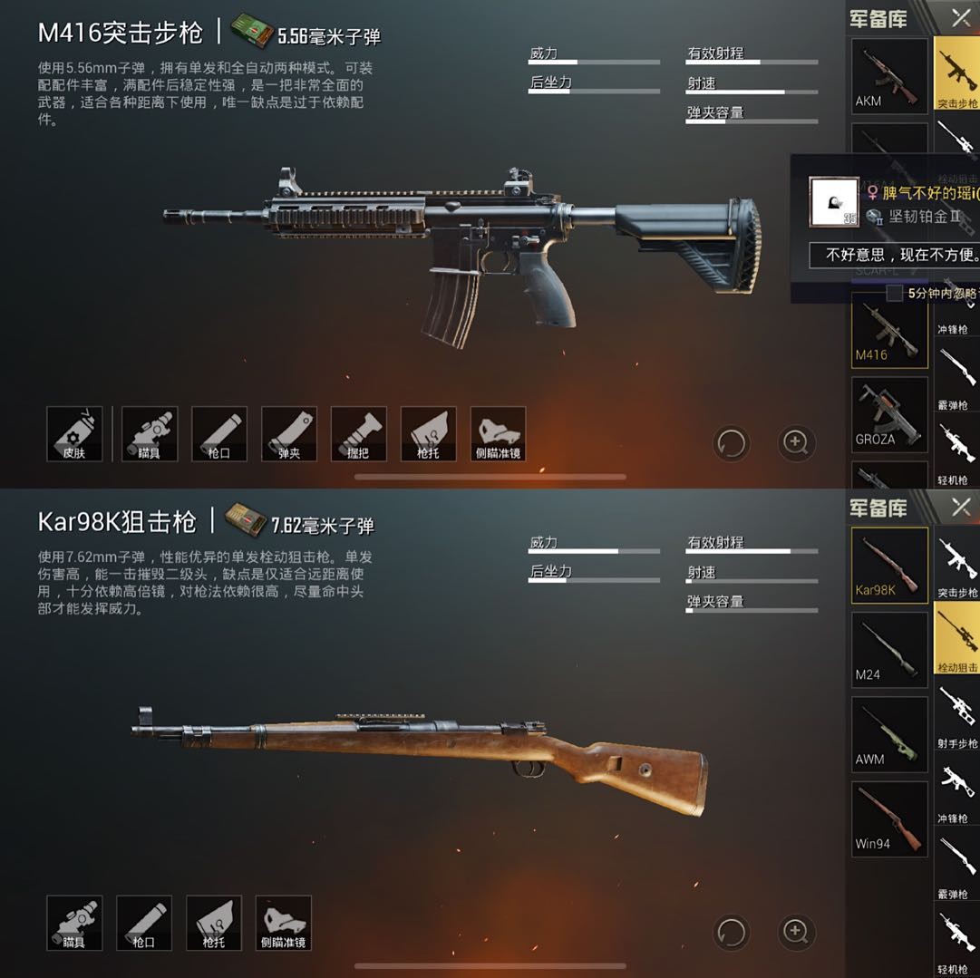这一套武器组合算是比拟经典和常见的了,两把枪都是玩家十分喜欢的枪,在游戏里能发挥出来的效果也十分全面,98K的超高迸发和M416满配后的超强稳定性,使得我们不论是在近间隔刚枪还是中远间隔点人都不在话下,特别是在单人排位中,这样的搭配简直没有硬伤。