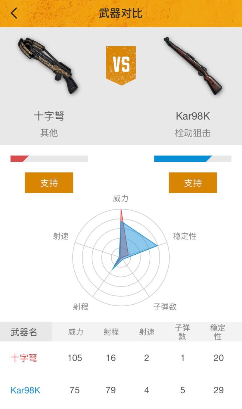 由于十字弩的特殊攻击机制决议了这把枪并不合适近间隔作战或者是遭遇战,所以我们不能拿十字弩来和步枪或者冲锋枪作比照,独一和十字弩攻击方式比拟类似的可能就是单发狙了。所以我们就拿比拟抢手的98K和十字弩来做一个比照。