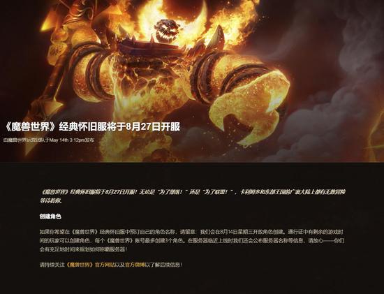 《魔兽世界:经典旧世》正式上线时间:2019年8月27日!