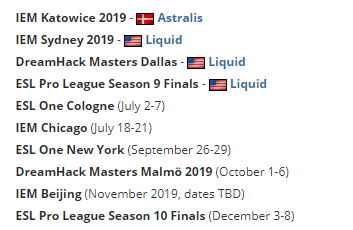 关于因特尔大满贯S3赛季,ESL并未发布。目前S2赛季开端于IEM 卡托维兹Major,也就是S1赛季完毕两个月之后。目前队伍获胜状况如下: