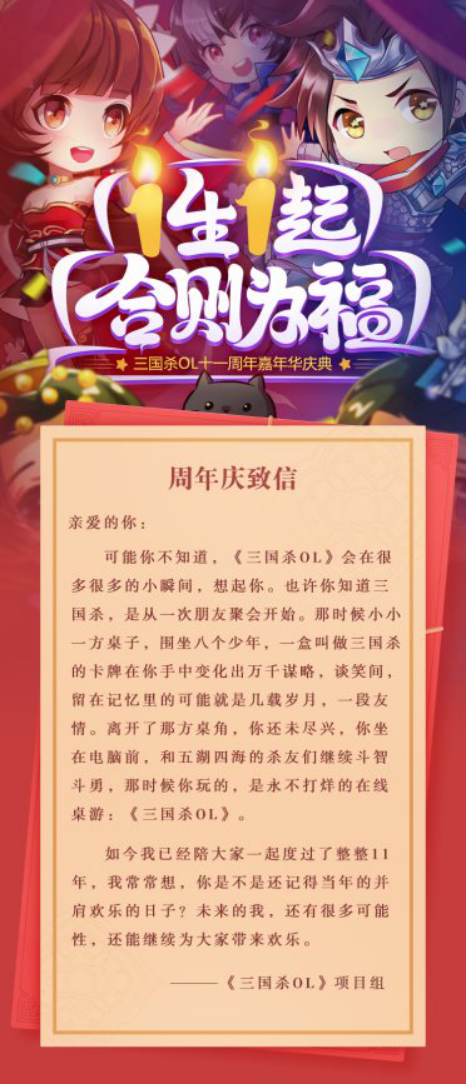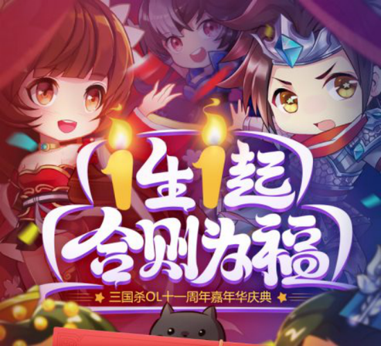 《三国杀OL》11周年嘉年华以“1生1起,合则为福”为主题展开一系列活动。11周年之际,为了回馈广阔玩家,给玩家提供大量的福利,同时,也为玩家送上年底祝愿。
