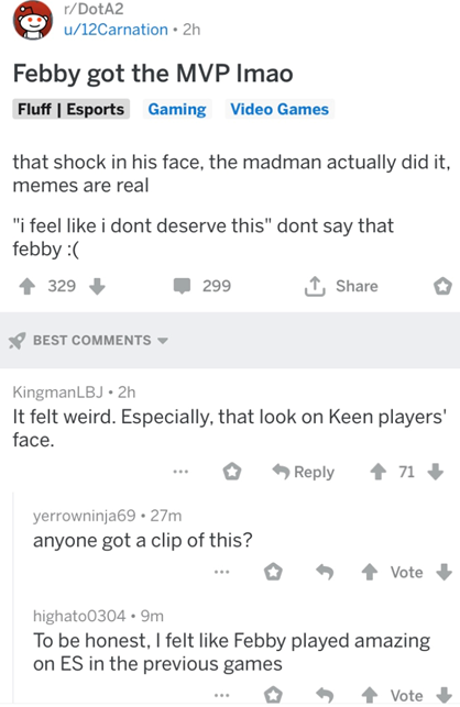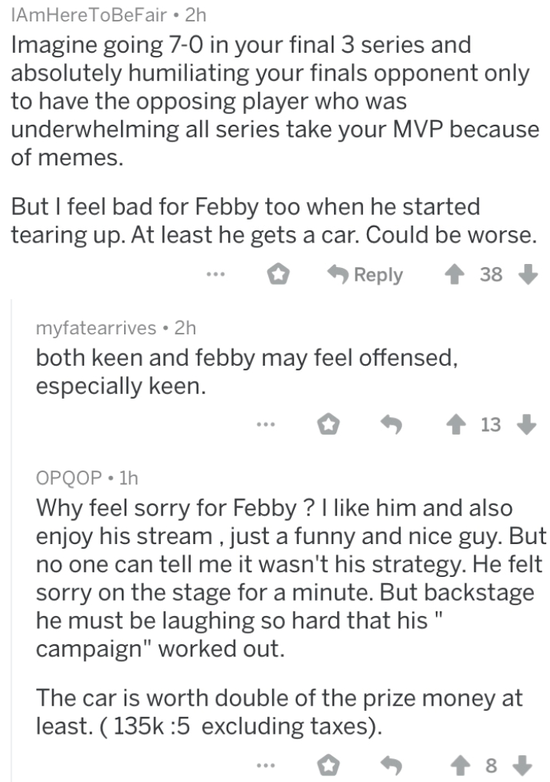——为什么要同情Febby?我喜欢他,也喜欢他的直播,他是个有意义的家伙。但是谁晓得这是不是他演的?他在台上是表现出一瞬的难过,但是到了后台,他肯定为他的胜利获选[由于国外直播平台当时在带节拍”投给Febby”]而笑掉大牙。